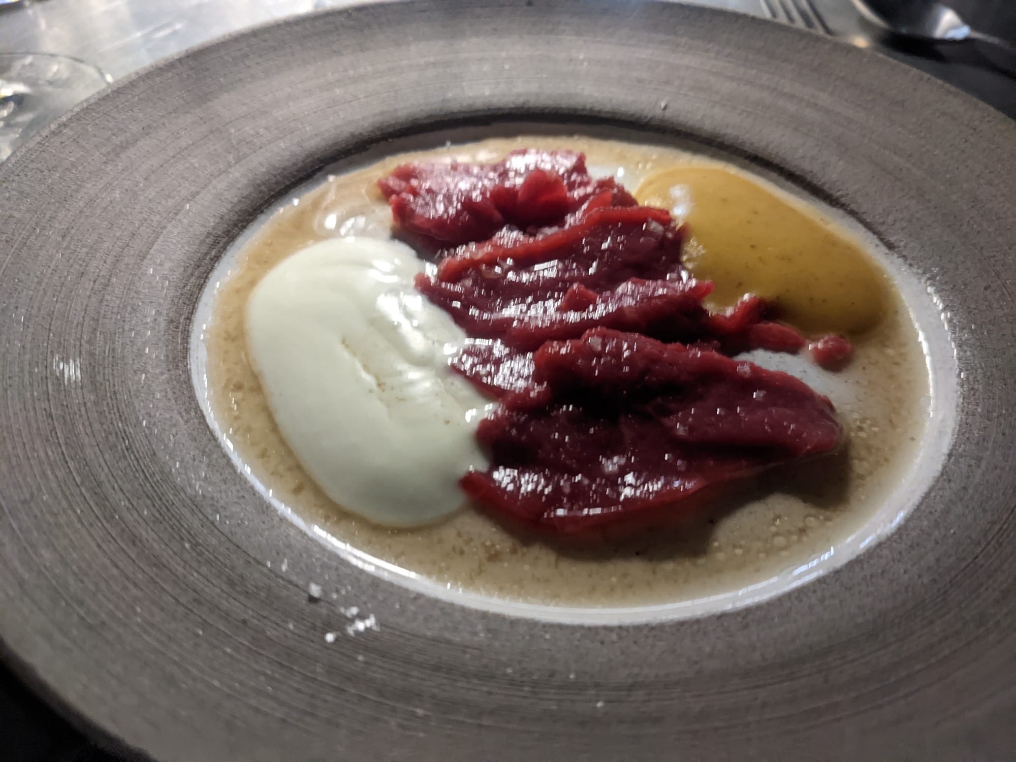 What you can probably call one of the signature dishes of the SRB Dairy Cow, where the raw beef of an dairy cow is served with yoghourt, caramelized cream, and stock.